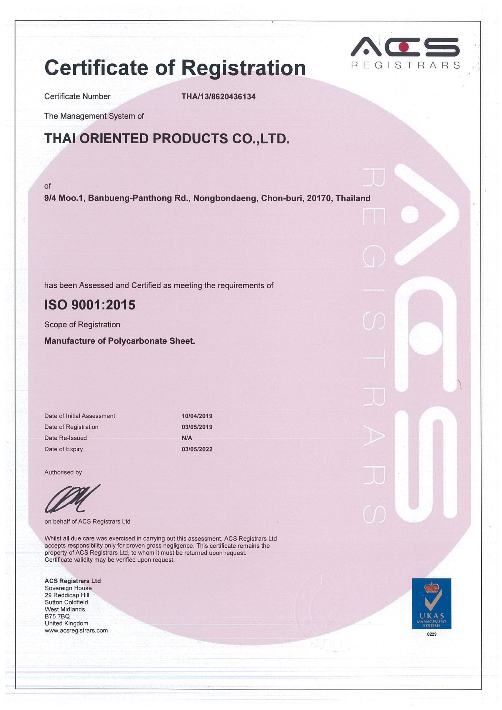 และกระบวนการผลิตของเรายังได้การรับรองคุณภาพมาตรฐาน ISO 9001:2008 จึงทำให้มั่นใจได้ว่าแผ่นโพลีคาร์บอเนตที่ผลิตโดยบริษัท ไทยโอเรียลเต็ดโปรดักส์ จำกัด